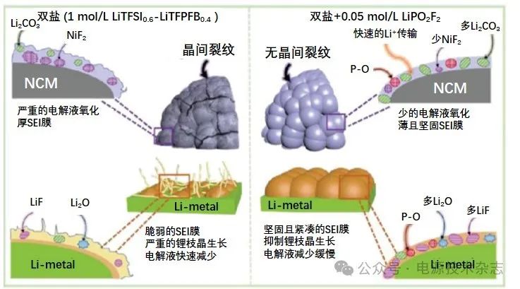 圖9 在雙鹽電解液中,添加劑LiPO2F2對(duì)Li負(fù)極和NMC 523正極表面積極影響的示意圖[108]