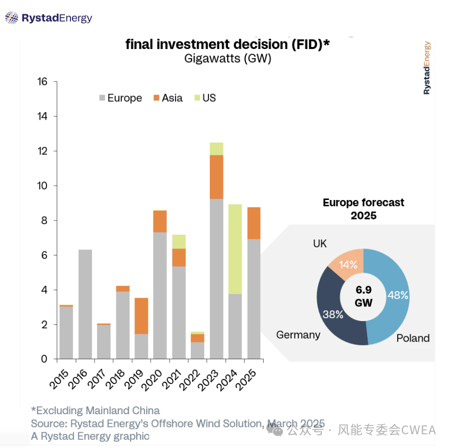 預(yù)計英國、波蘭和德國將在 2025 年引領(lǐng)歐洲最終投資決定的增長,將達(dá)到 9.5GW,這三個國家有多個項目正在等待最終批準(zhǔn)。尤其是波蘭的多個大型風(fēng)電場將獲得 FID,包括 Polenergia 和 Equinor 的 Baltyk II 和 III,Orsted 和 PGE 的 Baltica 2 項目。
