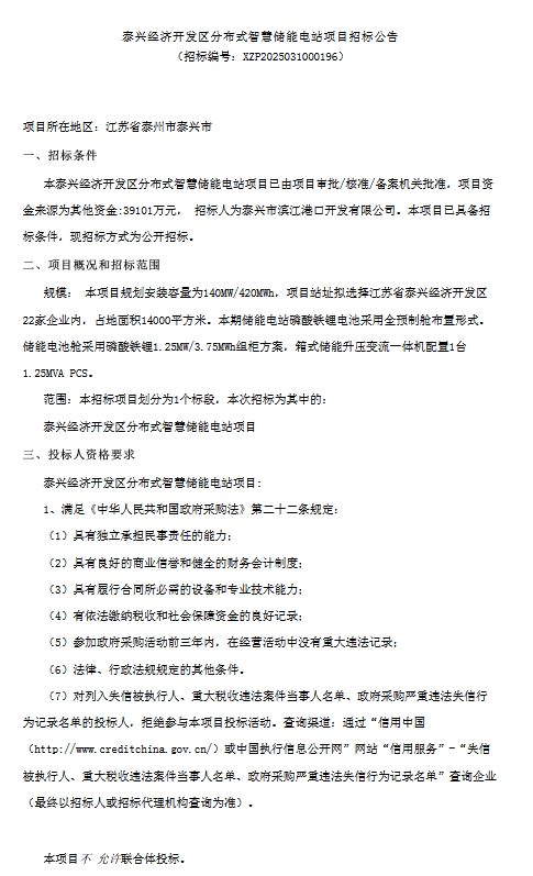 中國儲能網(wǎng)訊:3月10日,泰興市濱江港口開發(fā)有限公司發(fā)布了泰興經(jīng)濟開發(fā)區(qū)分布式智慧儲能電站項目招標(biāo)公告。本項目規(guī)劃安裝容量為140MW/420MWh,項目站址擬選擇江蘇省泰興經(jīng)濟開發(fā)區(qū)22家企業(yè)內(nèi),占地面積14000平方米。本期儲能電站磷酸鐵鋰電池采用全預(yù)制艙布置形式。儲能電池艙采用磷酸鐵鋰1.25MW/3.75MWh組柜方案,箱式儲能升壓變流一體機配置1臺1.25MVA PCS。