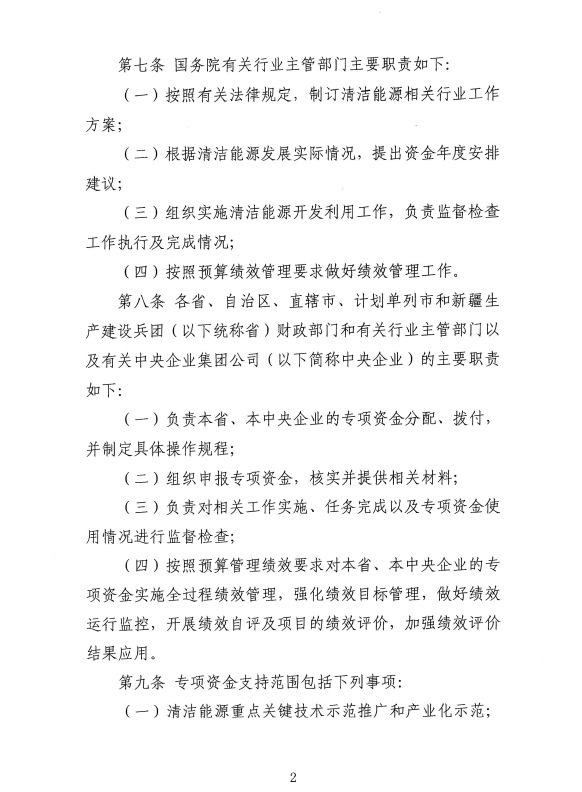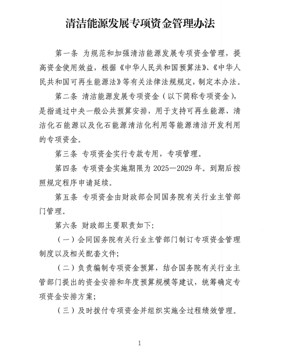 《辦法》規(guī)定,專項資金通過中央一般公共預(yù)算安排,用于支持可再生能源、清潔化石能源以及化石能源清潔化利用等能源清潔開發(fā)利用,實行??顚S茫瑢m椆芾?。