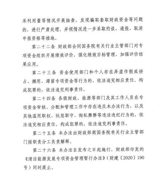 中國儲能網(wǎng)訊:3月12日,財政部印發(fā)《清潔能源發(fā)展專項資金管理辦法》(財建〔2025〕35號),要求規(guī)范和加強清潔能源發(fā)展專項資金管理,提高資金使用效益?!掇k法》自發(fā)布之日起施行,此前財政部印發(fā)的《清潔能源發(fā)展專項資金管理暫行辦法》(財建〔2020〕190號)同時廢止。