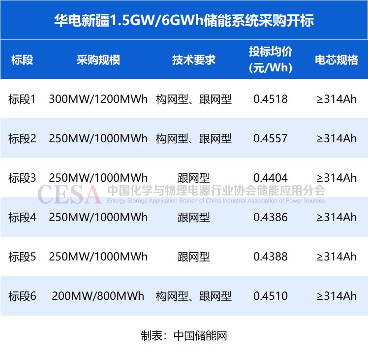 儲能系統(tǒng)包括構網(wǎng)型+跟網(wǎng)型技術、跟網(wǎng)型技術兩種類型。其中,標段一、二、六為構網(wǎng)型+跟網(wǎng)型儲能系統(tǒng)采購,投標報價均價為0.45285元/Wh,標段三-五為跟網(wǎng)型儲能系統(tǒng)采購,投標均價為0.4392元/Wh。