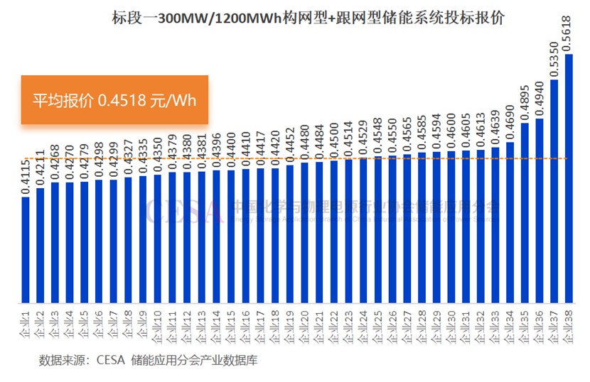 共38家企業(yè)競標,投標報價在0.4115-0.5618元/Wh區(qū)間內(nèi),投標均價0.4518元/Wh。