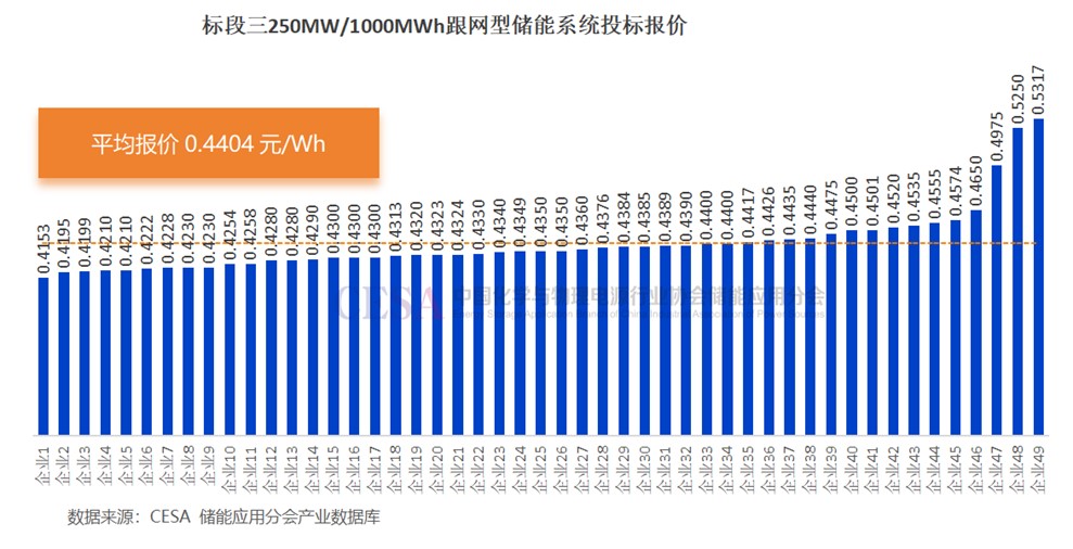 共49家企業(yè)競標,投標報價在0.4153-0.5317元/Wh區(qū)間內(nèi),投標均價0.4404元/Wh。