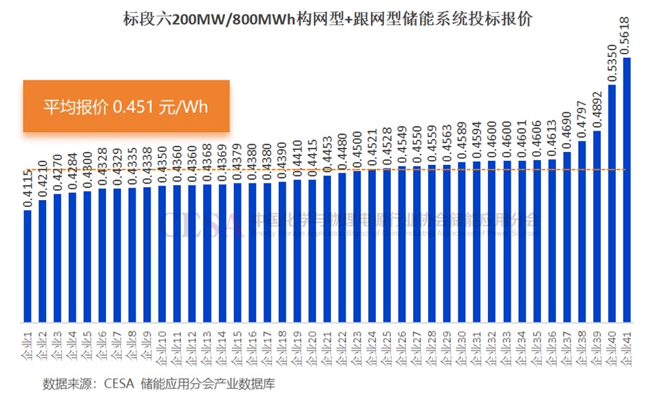 共41家企業(yè)參與競標,投標報價在0.427-0.5618元/Wh區(qū)間內(nèi),均價0.451元/Wh。