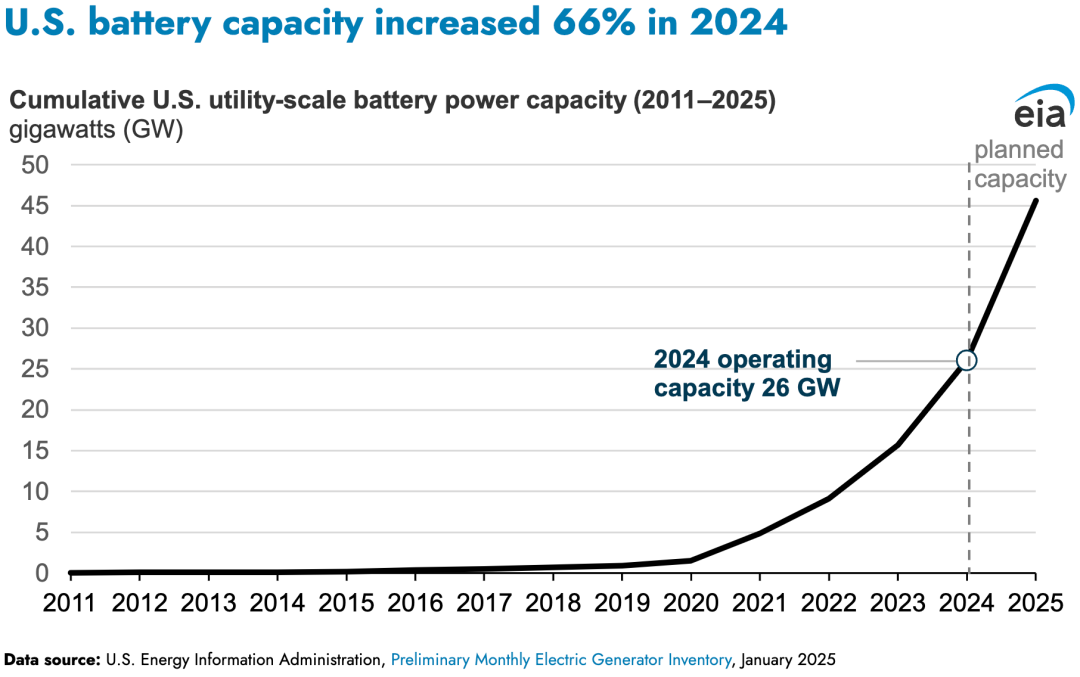 中國儲能網(wǎng)訊:根據(jù)美國能源信息署2025年1月的初步月度發(fā)電機(jī)組庫存數(shù)據(jù),在美國,截至2024年,美國累計(jì)公用事業(yè)規(guī)模的電池儲能容量已超過26吉瓦(GW)。2024年,美國發(fā)電企業(yè)新增了10.4吉瓦的電池儲能容量,僅次于太陽能發(fā)電,是當(dāng)年第二大新增發(fā)電能力來源。盡管電池儲能容量增長迅速,但在2024年,它僅占美國1230吉瓦公用事業(yè)規(guī)模發(fā)電能力的2%。