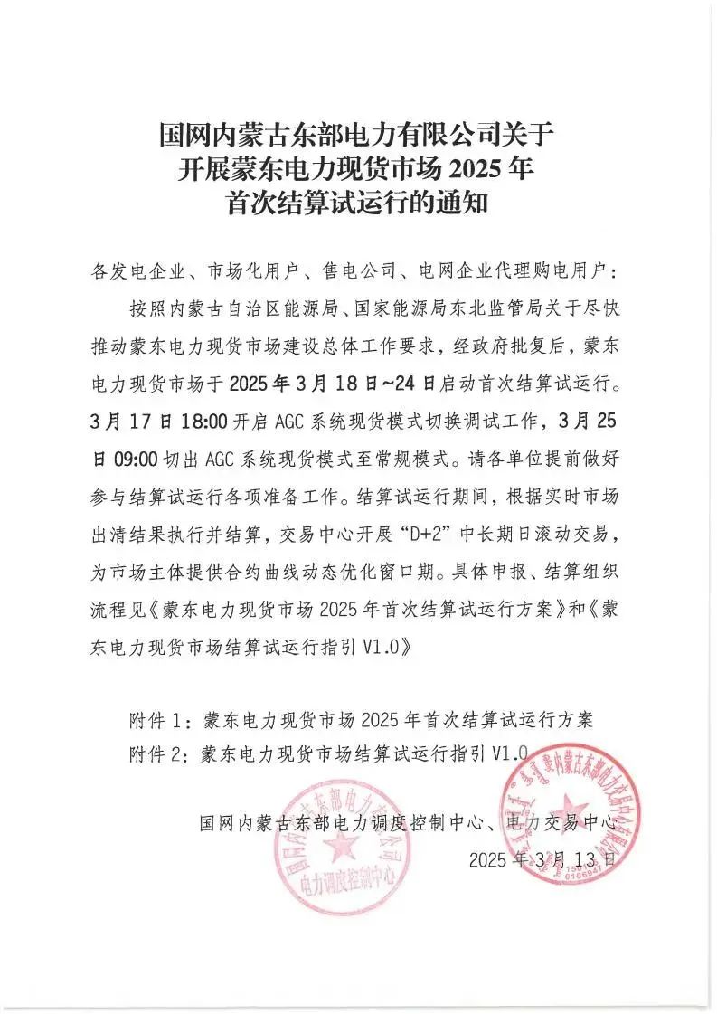 中國儲能網(wǎng)訊:近日,國網(wǎng)內(nèi)蒙古東部電力有限公司發(fā)布《蒙東電力現(xiàn)貨市場2025年首次結(jié)算試運(yùn)行工作方案》《蒙東電力現(xiàn)貨市場結(jié)算試運(yùn)行指引V1.0》。