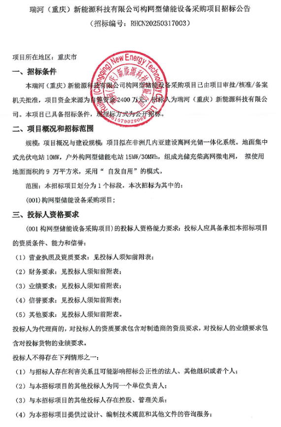 中國儲能網(wǎng)訊:3月18日,瑞河(重慶)新能源科技有限公司發(fā)布15MW/30MWh構(gòu)網(wǎng)型儲能設(shè)備采購項目招標(biāo)公告。包括完成設(shè)備的供貨(設(shè)計、制造,含備品、備件等)、裝配(含出廠前組裝、測試和檢驗等)、裝卸、運輸(含包裝、保險)、指導(dǎo)安裝、調(diào)試、驗收,以及質(zhì)量保證期內(nèi)的維修、維護、保養(yǎng)、人員培訓(xùn)等支持和其它相關(guān)伴隨服務(wù)等工作內(nèi)容。