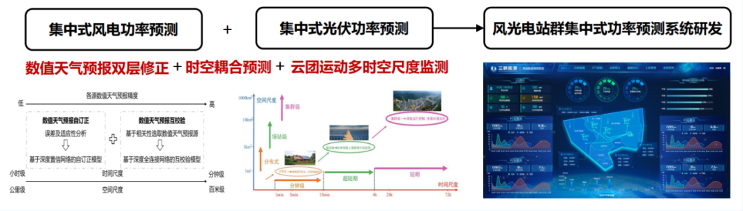 (1)“可測(cè)”為大規(guī)模區(qū)域風(fēng)光功率聯(lián)合預(yù)測(cè)技術(shù)。通過“數(shù)值天氣預(yù)報(bào)雙層修正+時(shí)空耦合預(yù)測(cè)+云團(tuán)運(yùn)動(dòng)多時(shí)空尺度監(jiān)測(cè)”,大幅度提升多時(shí)間尺度預(yù)測(cè)能力和預(yù)測(cè)精度,解決了數(shù)值天氣預(yù)報(bào)時(shí)間空間分辨率不足、現(xiàn)有“一場(chǎng)一測(cè)”模式限制區(qū)域場(chǎng)群功率預(yù)測(cè)精度、局地氣象環(huán)境與云團(tuán)生消形變影響下的光伏發(fā)電功率短時(shí)快速劇烈波動(dòng)等問題。