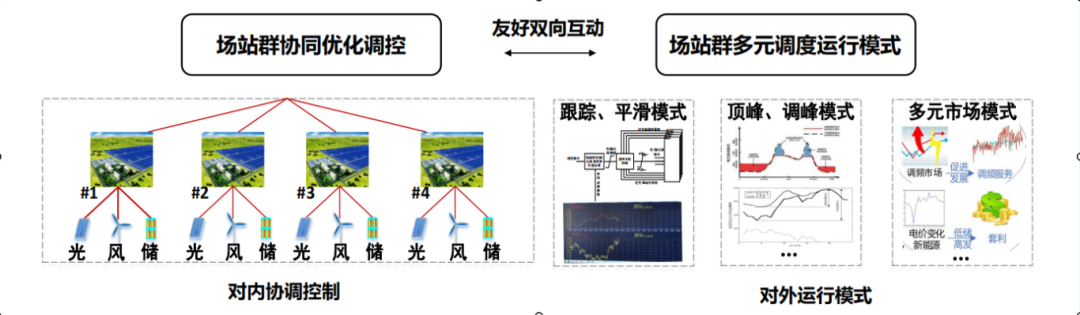 (3)“可調(diào)”為風(fēng)光儲(chǔ)場(chǎng)站群“網(wǎng)-源”協(xié)調(diào)關(guān)鍵機(jī)制。在時(shí)間維度方面,建立風(fēng)光儲(chǔ)場(chǎng)站群多時(shí)間尺度協(xié)同優(yōu)化調(diào)控模型,將新能源電站調(diào)度運(yùn)行模式由單一拓展為多元,時(shí)間尺度由常規(guī)實(shí)時(shí)控制拓展為日前計(jì)劃-日內(nèi)滾動(dòng)-實(shí)時(shí)協(xié)調(diào);在空間維度方面,設(shè)計(jì)含離線學(xué)習(xí)與在線決策的風(fēng)光儲(chǔ)場(chǎng)站群優(yōu)化調(diào)控快速求解算法,求解時(shí)間由分鐘級(jí)降低到秒級(jí),實(shí)現(xiàn)了風(fēng)光儲(chǔ)場(chǎng)站群有功/無功功率指令的快速精準(zhǔn)分配與優(yōu)化計(jì)算,在空間上實(shí)現(xiàn)風(fēng)光儲(chǔ)場(chǎng)站之間協(xié)同。