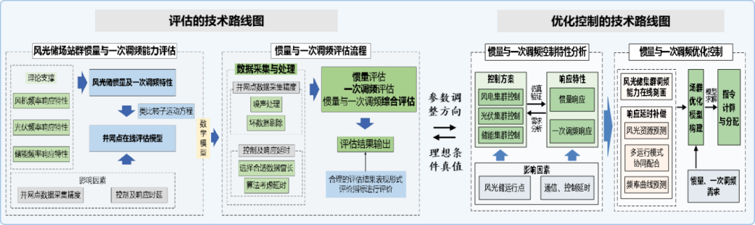 (4)“可支撐”為新能源快速一次調(diào)頻和虛擬慣量支撐技術(shù)。在電氣量測(cè)量方面,提出基于二次擬合的短時(shí)延頻率測(cè)量方法,突破了傳統(tǒng)算法只能測(cè)量5Hz以下的低振蕩頻率相量的限制;在頻率主動(dòng)支撐控制方面,構(gòu)建了考慮通信延時(shí)與控制精度的優(yōu)化模型,將一次調(diào)頻響應(yīng)時(shí)間由1s降低到300ms,實(shí)現(xiàn)了對(duì)頻率支撐功率的精細(xì)化控制;在頻率主動(dòng)支撐能力在線評(píng)估方面,設(shè)計(jì)了基于能量視角的場(chǎng)站等效調(diào)頻參數(shù)估計(jì)方法,等效慣量及等效調(diào)差率在線估計(jì)誤差均小于5%。