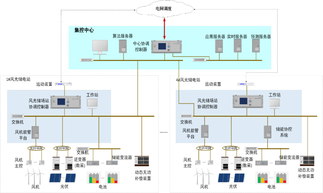 創(chuàng)新點(diǎn)1:在一體化智慧集控方面,本項(xiàng)目創(chuàng)新研發(fā)了風(fēng)光儲(chǔ)一體化智慧聯(lián)合集控系統(tǒng),在內(nèi)蒙古自治區(qū)能源局、內(nèi)蒙古電力集團(tuán)的支持下,該項(xiàng)目未采用電網(wǎng)調(diào)度主站直接控制的方式,由電網(wǎng)下達(dá)總指令至風(fēng)光儲(chǔ)一體化集控平臺(tái),然后由平臺(tái)進(jìn)行分配,保障本項(xiàng)目可在毫秒級(jí)范圍內(nèi)達(dá)到一體化協(xié)調(diào)控制。