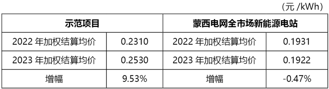 表1 示范項(xiàng)目與蒙西電網(wǎng)市場(chǎng)新能源電站2023年結(jié)算電價(jià)對(duì)比