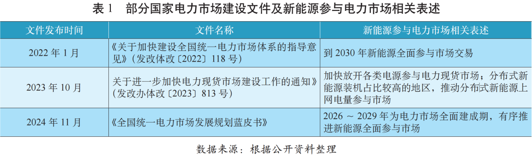 2025年是新一輪電力體制改革10周年,10年來(lái)我國(guó)基本建立了全國(guó)統(tǒng)一的電力市場(chǎng)總體框架和規(guī)則體系,初步建立了市場(chǎng)決定電力價(jià)格的機(jī)制。“十四五”期間,我國(guó)電力體制改革步伐加快,中長(zhǎng)期電力市場(chǎng)建設(shè)有序推進(jìn),現(xiàn)貨市場(chǎng)建設(shè)提速,多元競(jìng)爭(zhēng)格局初步形成,電力商品屬性凸顯,市場(chǎng)優(yōu)化配置資源的作用顯著增強(qiáng),市場(chǎng)化交易電量大幅提升。同時(shí),風(fēng)光等新能源實(shí)現(xiàn)了躍升發(fā)展,2023年新增裝機(jī)超過(guò)2.9億千瓦,2024年前11個(gè)月新增裝機(jī)超過(guò)2.5億千瓦,同比增長(zhǎng)25%,隨著各地新能源滲透率的持續(xù)提高,新能源參與電力市場(chǎng)的方式增加、范圍擴(kuò)大、規(guī)模和比例迅速上升。政策方向上,《關(guān)于加快建設(shè)全國(guó)統(tǒng)一電力市場(chǎng)體系的指導(dǎo)意見(jiàn)》(發(fā)改體改〔2022〕118號(hào))文件明確了宏觀指引和目標(biāo),其后國(guó)家層面出臺(tái)了相關(guān)政策(見(jiàn)表1))[1-3] 。通過(guò)市場(chǎng)實(shí)現(xiàn)新能源增量項(xiàng)目?jī)?yōu)化配置、各類(lèi)新能源項(xiàng)目電量?jī)?yōu)先上網(wǎng)和消納,已成必然趨勢(shì)。