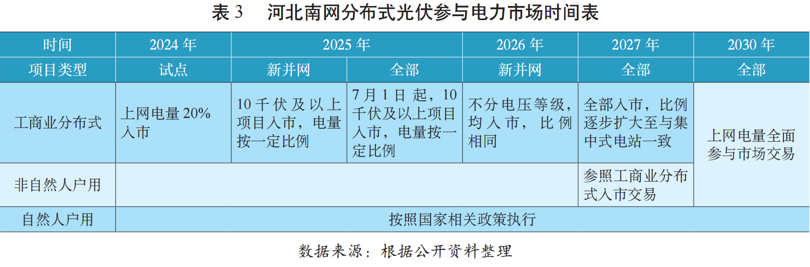 2024年 11 ~ 12 月,全國(guó) 12 個(gè)省份陸續(xù)出臺(tái)了 2025 年新能源參與市場(chǎng)政策,集中式新能源均將不同程度地參與,分布式新能源主要是河北南網(wǎng)和山東出臺(tái)了政策、其他省份政策則不強(qiáng)制參與或鼓勵(lì)參與(見(jiàn)表 2)。此外,河北省發(fā)展改革委在 2024 年 11 月出臺(tái)的政策中明確了河北南網(wǎng)分布式光伏參與市場(chǎng)的時(shí)間表(見(jiàn)表 3)。對(duì)比上一年的政策,江蘇、廣東等部分東中部和南方省份推進(jìn)力度加大,雖然分布式新能源參與市場(chǎng)的范圍相對(duì)有限,但從集中式新能源參與市場(chǎng)的推進(jìn)速度來(lái)看,預(yù)期后續(xù)分布式新能源參與市場(chǎng)的進(jìn)程將加快,逐步推進(jìn)最終可能與集中式新能源參與市場(chǎng)程度拉平。