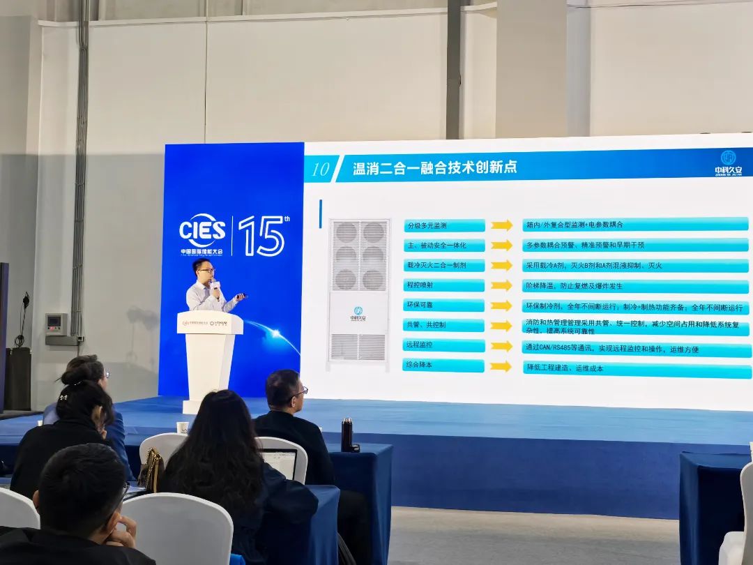 隨著儲能系統(tǒng)規(guī)?;瘧茫踩c能效管理成為核心挑戰(zhàn)。3月24日下午,大會“新品發(fā)布專場”迎來了中科久安的技術高光時刻。項目技術部部長林啟明發(fā)表《全周期管理的儲能溫消一體化融合技術》的主題演講,中科久安首次公開傳播儲能溫控與消防深度協(xié)同的創(chuàng)新方案,直擊行業(yè)痛點。