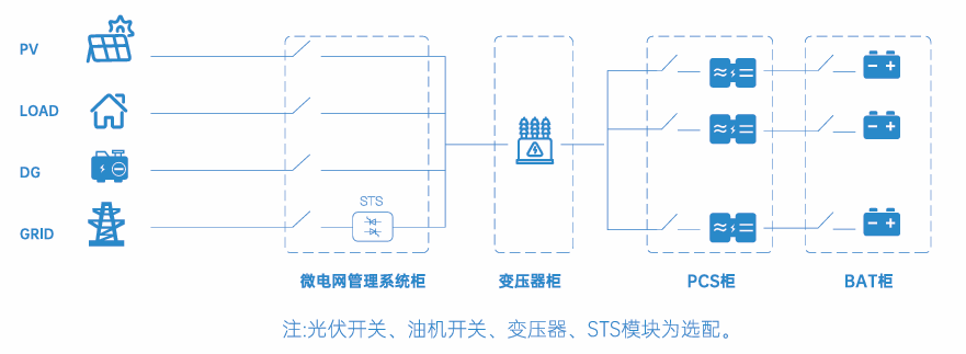 通過集中管理油機(jī)、光伏、負(fù)載及市電的控制斷路器,實現(xiàn)并離網(wǎng)無縫切換。這種設(shè)計不僅提升了系統(tǒng)穩(wěn)定性和可靠性,并優(yōu)化了能源配置,實現(xiàn)光伏、油機(jī)、市電等多種能源的高效整合與智能分配。