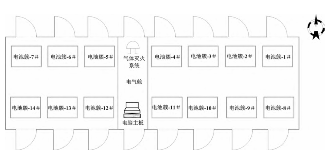 該儲(chǔ)能電站設(shè)有4座集裝箱式儲(chǔ)能電池艙及儲(chǔ)能升壓一體艙。每個(gè)電池艙內(nèi)含14個(gè)電池簇,每個(gè)電池簇內(nèi)裝配25個(gè)電池模塊。此次起火艙室為1號(hào)電池艙。