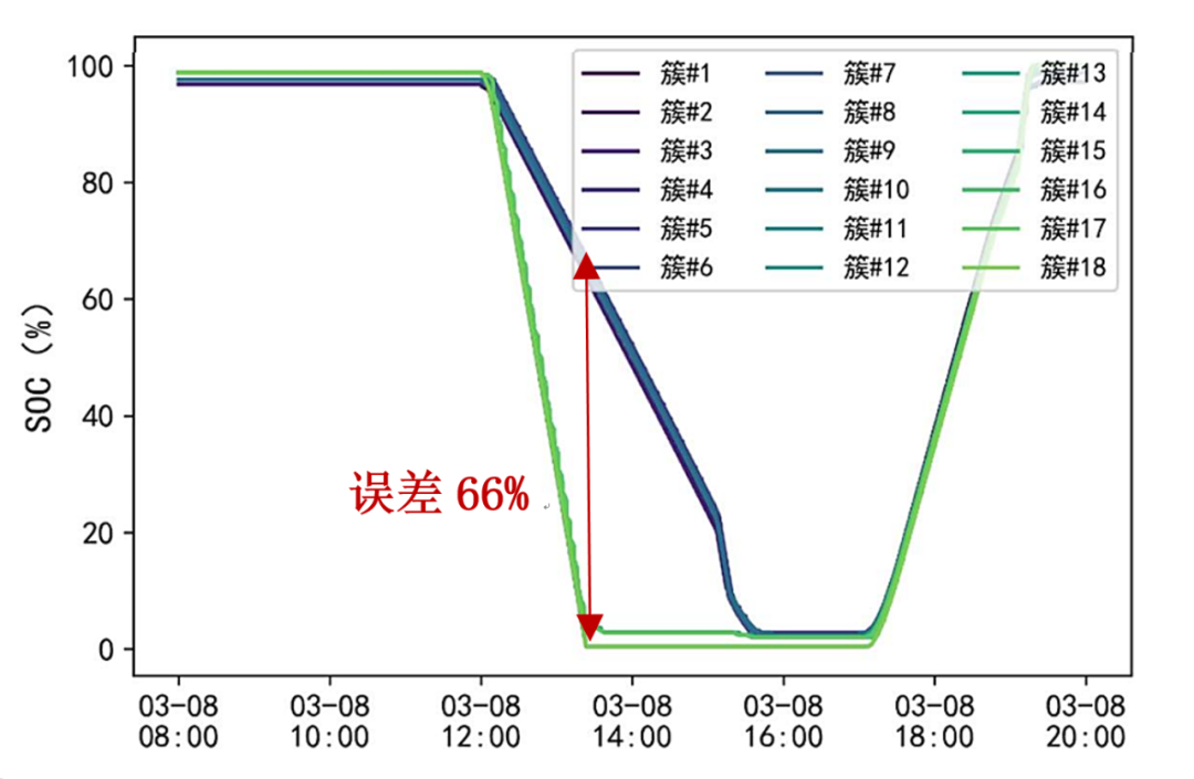 圖3:某儲(chǔ)能電站BMS評(píng)估各簇SOC一致性良好的電池時(shí)出現(xiàn)近66%的誤差