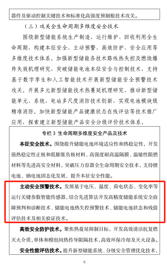 2025年2月17日,工信部等八部門(mén)聯(lián)合印發(fā)《新型儲(chǔ)能制造業(yè)高質(zhì)量發(fā)展行動(dòng)方案》,明確提出“加強(qiáng)新型儲(chǔ)能各技術(shù)路線熱失控及燃燒爆炸失效機(jī)理研究,發(fā)展基于電壓、溫度、荷電狀態(tài)、變化率等運(yùn)行關(guān)鍵參數(shù)智能傳感器,結(jié)合先進(jìn)算法開(kāi)發(fā)高精度儲(chǔ)能系統(tǒng)安全故障預(yù)判和診斷技術(shù)、儲(chǔ)能電池?zé)崾Э仡A(yù)警技術(shù)、儲(chǔ)能電池狀態(tài)和殘值評(píng)估技術(shù)及相關(guān)驗(yàn)證技術(shù)”,該方案嚴(yán)密契合將電站安全防控建設(shè)融入日常安全評(píng)估、早期故障檢出和重大事故預(yù)警三大環(huán)節(jié),實(shí)現(xiàn)安全防控主動(dòng)、科學(xué)與體系化的實(shí)踐要求。