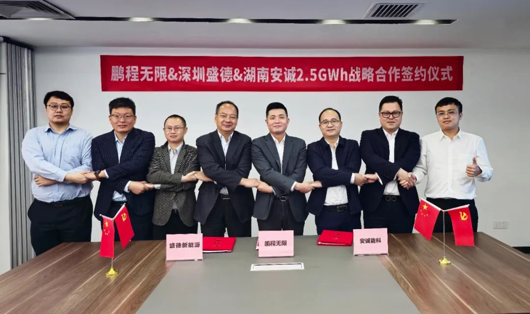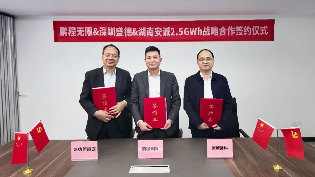 中國儲能網(wǎng)訊:近日,鵬程無限與深圳盛德新能源科技有限公司(以下簡稱“盛德新能源”)、湖南安誠新能源有限公司(以下簡稱“安誠能科”)簽署戰(zhàn)略協(xié)議,三方將圍繞2.5GWh儲能設(shè)備展開合作。