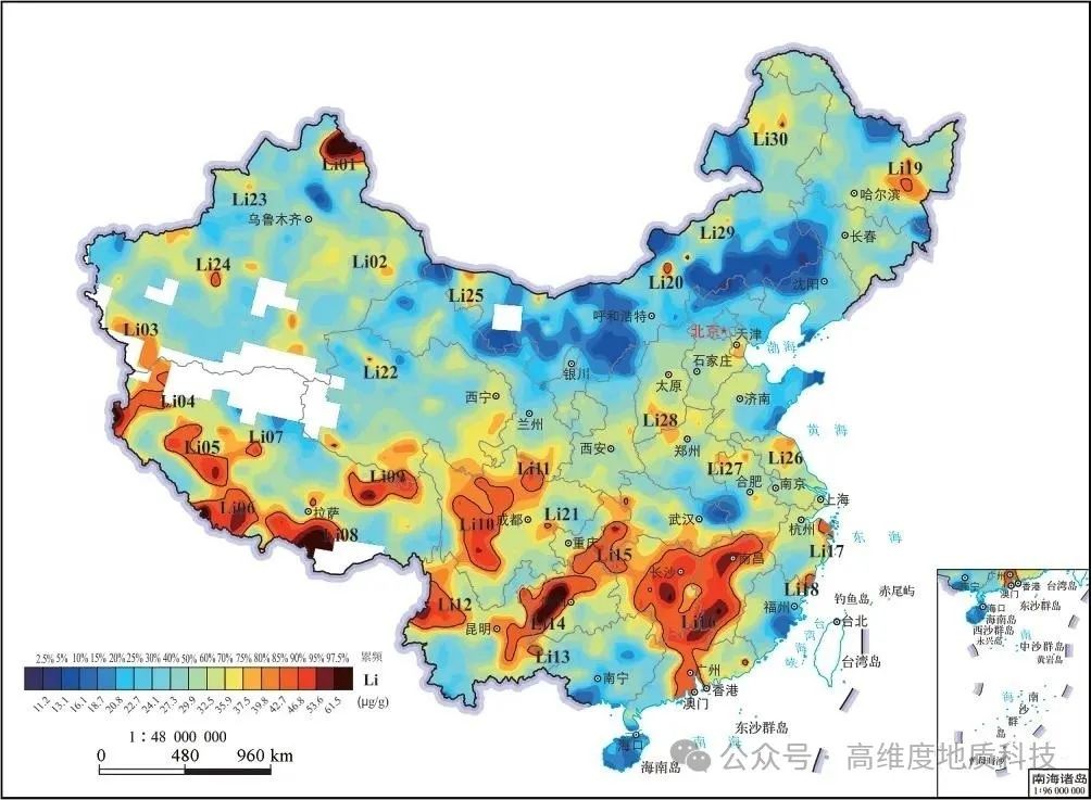 在鋰成礦區(qū)域,往往會(huì)出現(xiàn)明顯的地球化學(xué)異常。通過(guò)對(duì)區(qū)域巖石、土壤、水系沉積物等介質(zhì)的地球化學(xué)測(cè)量,可以發(fā)現(xiàn)鋰(Li)元素的高值異常區(qū)。這些異常區(qū)通常與成礦母巖和構(gòu)造活動(dòng)密切相關(guān)。例如,在一些鋰成礦帶,通過(guò)1:20萬(wàn)區(qū)域化探掃面,發(fā)現(xiàn)了多個(gè)鋰的高值異常區(qū),為后續(xù)的找礦工作提供了重要線索。