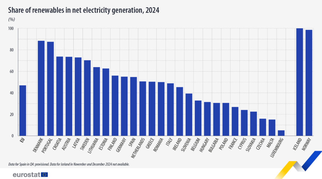 中國儲能網(wǎng)訊:據(jù)歐盟統(tǒng)計局的發(fā)表數(shù)據(jù),2024年歐盟凈發(fā)電量中有46.9%來自可再生能源。在歐盟國家中,丹麥的凈發(fā)電量中可再生能源占比最高,達到88.4%,主要來自風能,其次是葡萄牙(87.5%,主要來自風能和水能)和克羅地亞(73.7%,主要來自水能)??稍偕茉凑急茸畹偷膰沂潜R森堡(5.1%)、馬耳他(15.1%)和捷克(15.9%)。