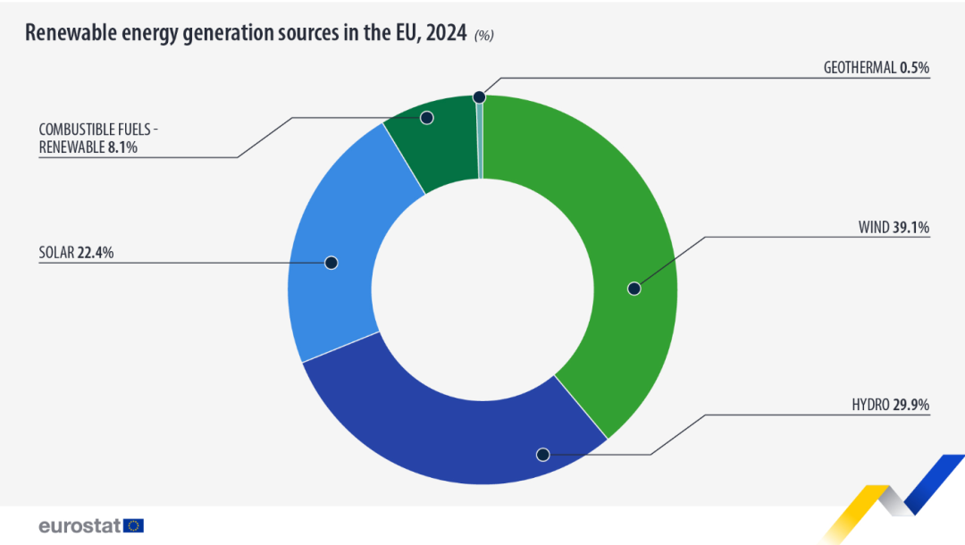風能和水能占歐盟可再生能源發(fā)電總量的三分之二以上(分別為39.1%和29.9%)。其余三分之一的電力來自太陽能(22.4%)、可燃燃料(8.1%),以及僅約0.5%來自地熱能。