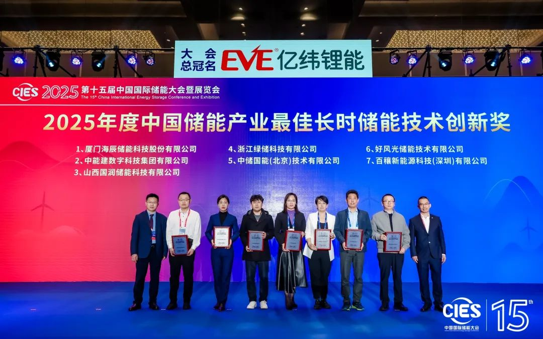 在頒獎(jiǎng)盛典上,浙江綠儲(chǔ)科技有限公司榮膺2025年度中國儲(chǔ)能產(chǎn)業(yè)最佳長時(shí)儲(chǔ)能技術(shù)創(chuàng)新獎(jiǎng)!除綠儲(chǔ)科技之外,同獲該獎(jiǎng)項(xiàng)的還有中能建、中儲(chǔ)國能等6家長時(shí)儲(chǔ)能業(yè)界同仁。