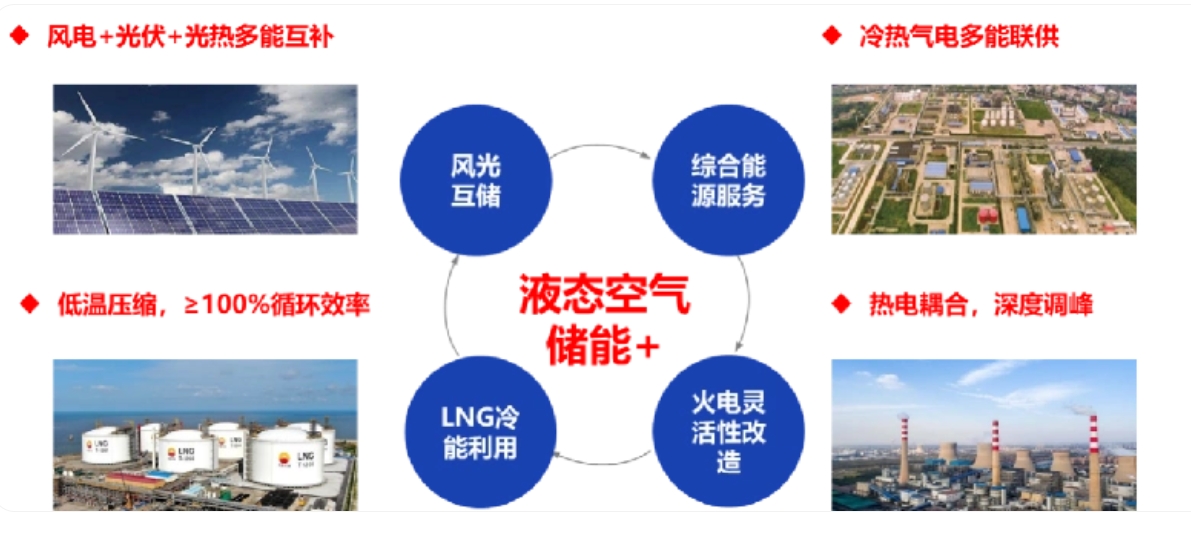 相對于其他大規(guī)模長時儲能技術(shù),液態(tài)空氣儲能技術(shù)具有不受地理條件限制和常壓儲存的突出優(yōu)勢,是易于實現(xiàn)多能互補聯(lián)供、應(yīng)用場景靈活多元的前沿儲能技術(shù)之一。