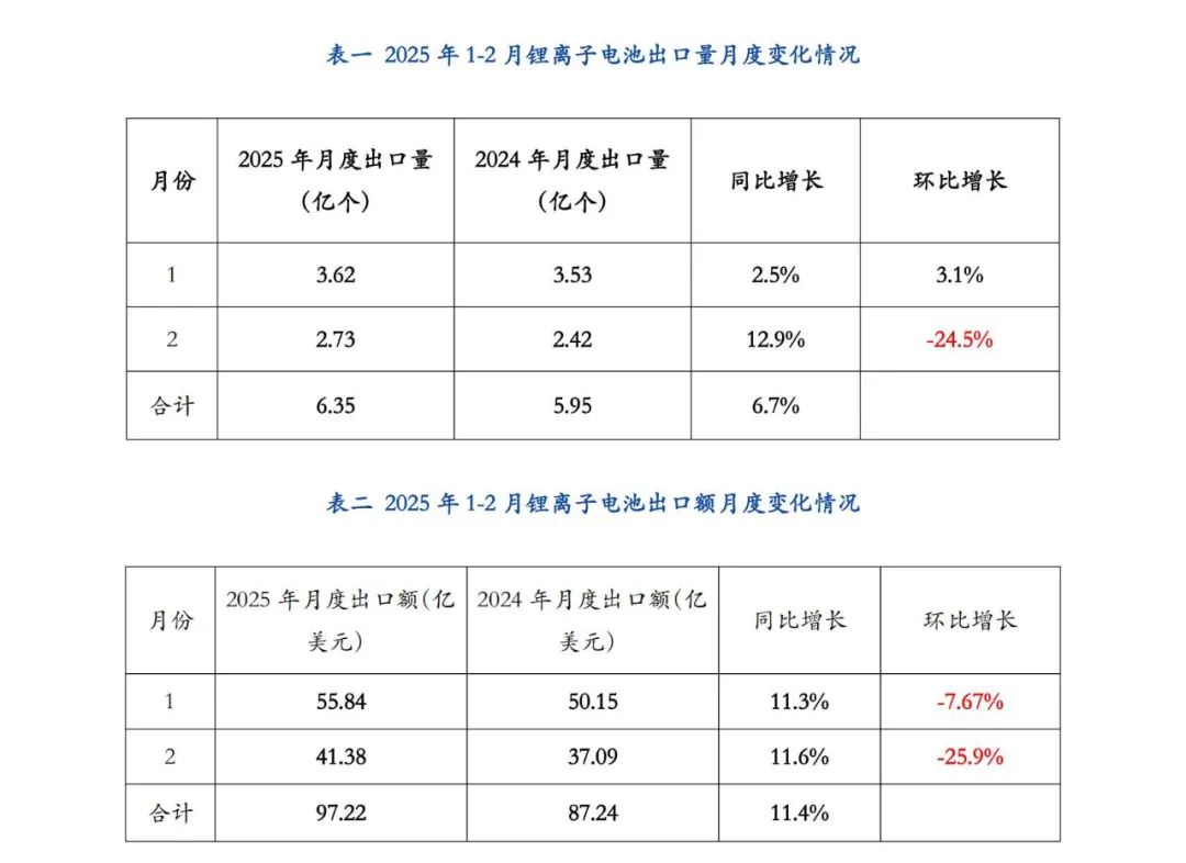 中國(guó)儲(chǔ)能網(wǎng)訊:2025年1-2月鋰離子電池出口數(shù)量為6.35億個(gè),同比增長(zhǎng)12.9%;2025年1-2月我國(guó)鋰離子電池出口額為97.22億美元,同比增加11.4%,出口總體態(tài)勢(shì)良好。其中,2025年1、2月份出口額環(huán)比分別下降7.67%和25.9%,據(jù)分析,由于企業(yè)可能在節(jié)前集中完成訂單,春節(jié)假期導(dǎo)致生產(chǎn)與出口節(jié)奏放緩,進(jìn)而影響出口環(huán)比表現(xiàn)。出口“量增價(jià)減”趨勢(shì)延續(xù),尤其是在國(guó)際市場(chǎng)競(jìng)爭(zhēng)加劇的背景下,企業(yè)可能通過(guò)降價(jià)策略爭(zhēng)奪市場(chǎng)份額。2024年碳酸鋰等原材料價(jià)格下行,傳導(dǎo)至出口價(jià)格存在滯后性,企業(yè)可能通過(guò)降價(jià)清庫(kù)存或提前鎖定低價(jià)訂單,進(jìn)一步壓縮利潤(rùn)空間。