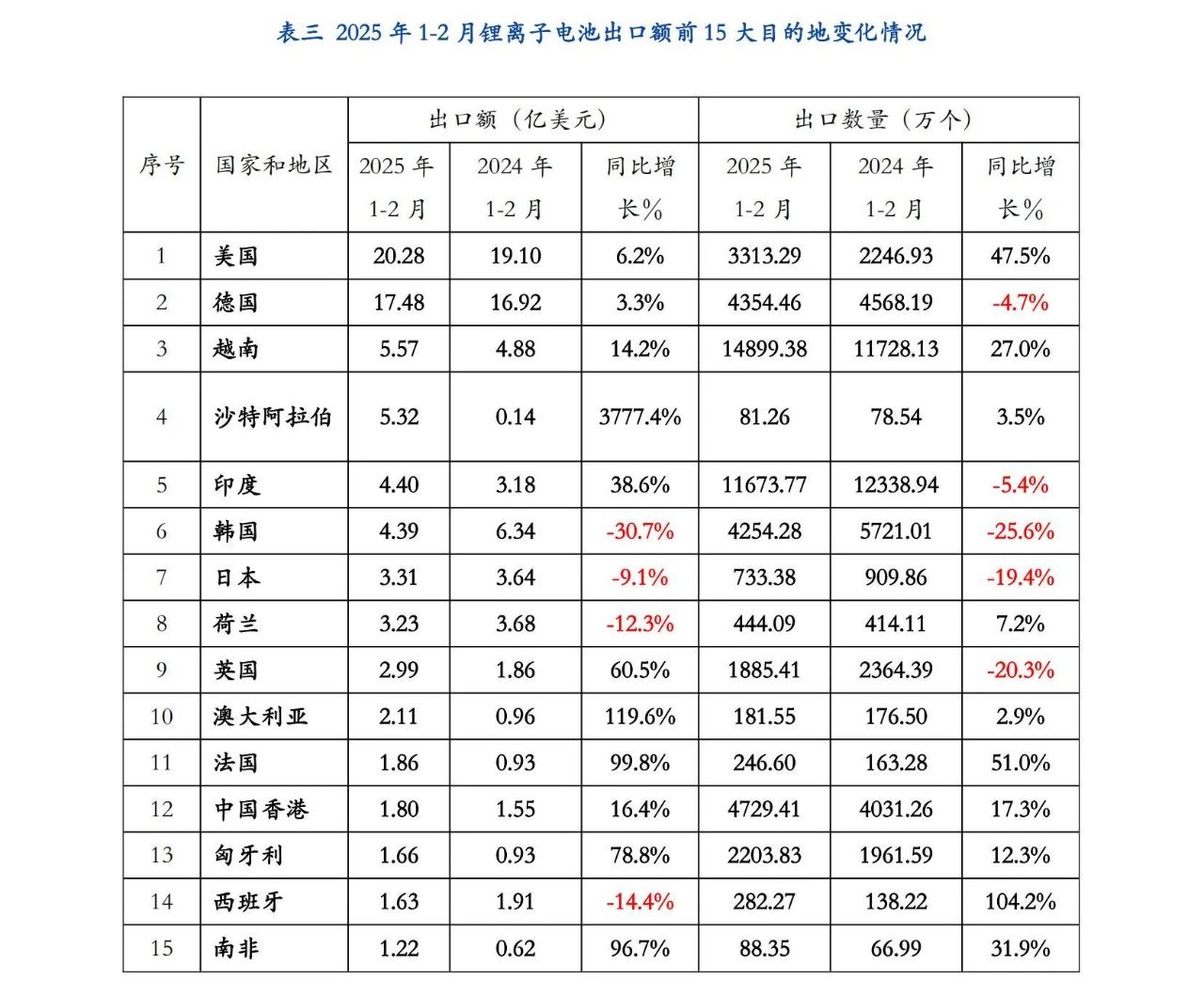 美國(guó)仍是我國(guó)鋰離子電池第一大出口市場(chǎng),2025年1-2月出口美國(guó)金額為20.28億美元,同比增長(zhǎng)6.2%,占我國(guó)鋰離子出口總額的22.5%。第二大市場(chǎng)仍為德國(guó),出口金額為17.48億美元,同比增加3.3%,占我國(guó)鋰離子電池出口額的18%;越南代替2024年同期的韓國(guó)成為第三大出口市場(chǎng),出口金額為5.57億美元,同比增長(zhǎng)14.2%,占我國(guó)鋰離子電池出口額的5.7%。