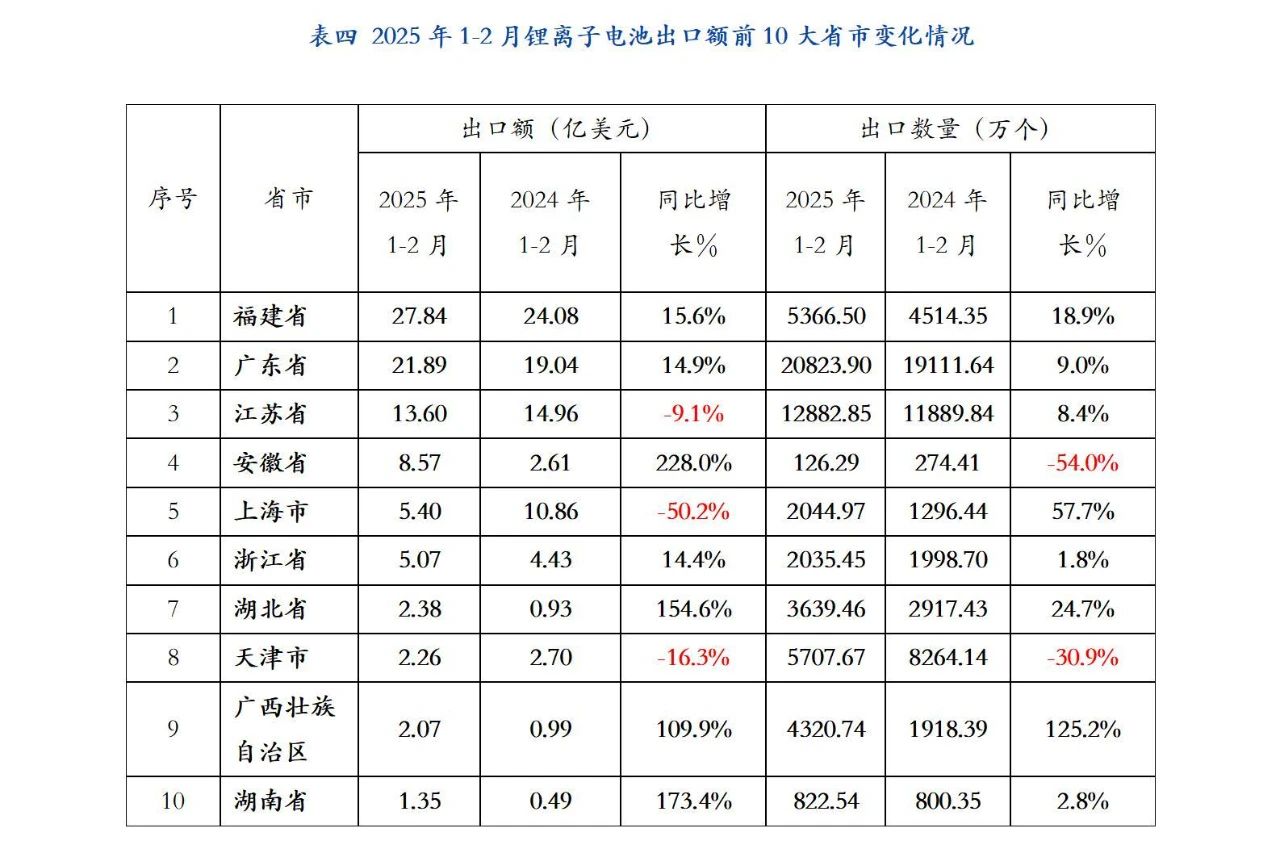 2025年1-2月福建省仍是我國(guó)鋰離子電池出口產(chǎn)品的最大來(lái)源地,出口金額為27.84億美元,同比增長(zhǎng)15.6%,占我國(guó)鋰離子電池出口額的28.6%;出口數(shù)量為5366.5萬(wàn)個(gè),同比增長(zhǎng)18.9%。廣東省位居第二,出口金額為21.89億美元,同比增加14.9%,占我國(guó)鋰離子電池出口額的22.5%;出口數(shù)量20823.90萬(wàn)個(gè),同比增長(zhǎng)9%。江蘇省排名第三,出口額為13.6億美元,同比減少9.1%,占我國(guó)鋰離子電池出口額的14%;出口數(shù)量11889.84萬(wàn)個(gè),同比增長(zhǎng)8.4%。福建、廣東和江蘇三省的鋰離子電池出口額占到全國(guó)鋰離子電池出口額的65.1%。