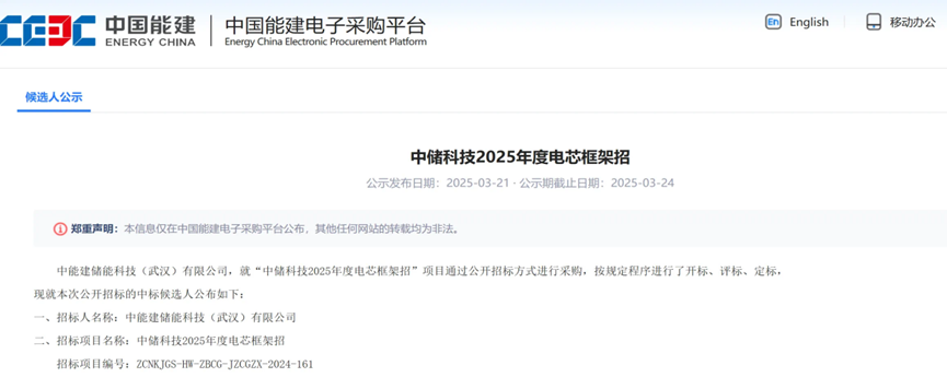 中國(guó)儲(chǔ)能網(wǎng)訊:3月21日,中能建儲(chǔ)能科技(武漢)有限公司”中儲(chǔ)科技2025年度電芯框架招” 項(xiàng)目發(fā)布中標(biāo)候選人。贛鋒鋰電以第一候選人入圍標(biāo)包2,據(jù)悉,該項(xiàng)目此次招標(biāo)共分兩個(gè)標(biāo)包,總招標(biāo)量達(dá)6GWh,擬采購(gòu)0.25C、0.5C及1C儲(chǔ)能電芯。