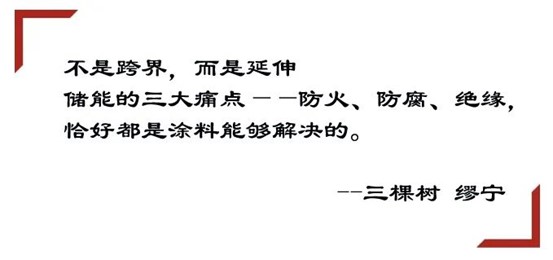 很多人問(wèn)三棵樹(shù)為什么能跨界儲(chǔ)能、新能源領(lǐng)域,繆寧笑著說(shuō),"其實(shí)不是跨界,而是延伸。儲(chǔ)能的三大痛點(diǎn)——防火、防腐、絕緣,恰好都是涂料能夠解決的。"