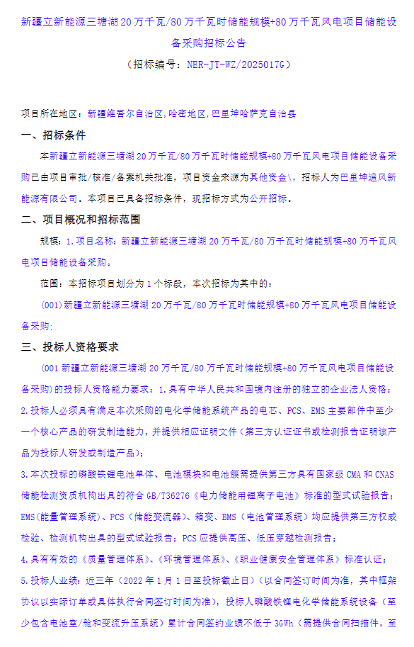 中國儲能網(wǎng)訊:3月31日,新疆立新能源發(fā)布三塘湖200MW/800MWh儲能規(guī)模+800MW風(fēng)電項(xiàng)目儲能設(shè)備采購招標(biāo)。本標(biāo)段采購范圍包括但不限于200MW/800MWh構(gòu)網(wǎng)型儲能系統(tǒng)所需設(shè)備的供貨及指導(dǎo)安裝,且包含成套設(shè)備五年質(zhì)保期服務(wù)。