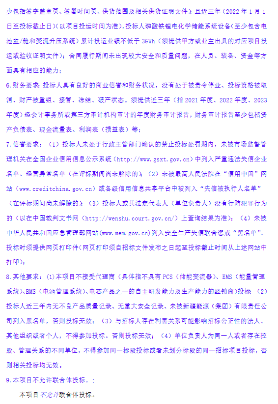 要求投標(biāo)人具備電芯、PCS、EMS中至少一個(gè)核心產(chǎn)品的研發(fā)制造能力,且PCS要求具備高壓、低壓穿越檢測報(bào)告,且近三年儲能系統(tǒng)累計(jì)簽約和累計(jì)投運(yùn)業(yè)績不低于3GWh。