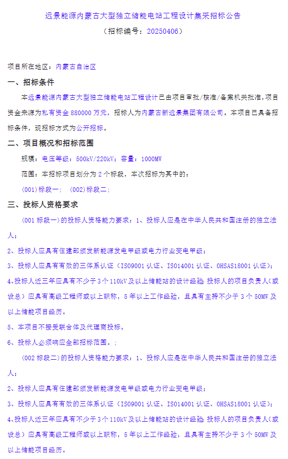 中國儲能網(wǎng)訊:4月7日,遠景能源發(fā)布內蒙古大型獨立儲能電站工程設計集采招標公告。項目資金來源為私有資金880000萬元,折合總投資單價1.1元/Wh,招標人為內蒙古新遠景集團有限公司。