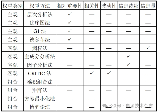 客觀賦權(quán)法則是基于數(shù)據(jù)信息來確定權(quán)重的方法,這種方法不依賴于專家的主觀判斷,而是通過數(shù)理統(tǒng)計方法來實現(xiàn),主要有熵權(quán)(值)法、主成分分析法、因子分析法和CRITIC法。熵權(quán)法是客觀賦權(quán)法最常用的方法,能夠客觀地反映各指標(biāo)在綜合評價中的重要性,避免主觀因素的影響,通過計算各指標(biāo)的信息熵值來確定指標(biāo)的權(quán)重。文獻(xiàn)[38]根據(jù)往年的歷史數(shù)據(jù),用熵權(quán)法確定指標(biāo)權(quán)重,并結(jié)合模型控制預(yù)測,實時跟蹤儲能SOC的計劃值。文獻(xiàn)[39]選取電池剩余容量、開路電壓和直流等效內(nèi)阻作為評價指標(biāo),并用熵權(quán)法計算指標(biāo)權(quán)重。實際應(yīng)用中,熵權(quán)法將指標(biāo)作為獨(dú)立的存在,忽略了指標(biāo)間的相關(guān)性,同時對數(shù)據(jù)質(zhì)量和樣本性要求較高。主成分分析法和因子分析法兩者都是通過降維的思想,?用較少的新變量(?主成分或因子)?來概括原始數(shù)據(jù)中的信息,?從而簡化數(shù)據(jù)結(jié)構(gòu)。?CRITIC法主要通過使用標(biāo)準(zhǔn)差來表示指標(biāo)的相關(guān)性對比強(qiáng)度,?數(shù)據(jù)標(biāo)準(zhǔn)差越大,?表明數(shù)據(jù)波動越大,?權(quán)重就越高,適用于多指標(biāo)多對象的綜合評價問題,?能夠消除一些相關(guān)性較強(qiáng)的指標(biāo)影響,?減少指標(biāo)之間信息上的重疊,?從而得到更可信的評價結(jié)果。文獻(xiàn)[40-41]綜合考慮指標(biāo)間的差異性和相關(guān)性,采用CRITIC法確定指標(biāo)權(quán)重。在實際操作中,如何確保數(shù)據(jù)的代表性和準(zhǔn)確性?是CRITIC法的主要問題,且當(dāng)數(shù)據(jù)分布不均和存在異常值時為了提高評價結(jié)果的準(zhǔn)確性和適用性,還需要結(jié)合其他賦權(quán)方法進(jìn)行綜合分析。