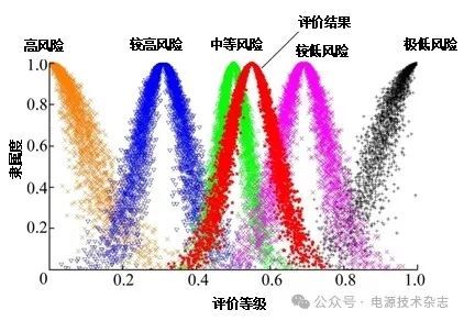 云模型法結(jié)合模糊數(shù)學(xué)和概率論原理,能夠綜合處理定性和定量信息,適用于處理信息具有不確定性和模糊性的復(fù)雜評價問題,通過綜合指標(biāo)風(fēng)險評價云圖和評價標(biāo)準(zhǔn)云圖進(jìn)行對比,得出評價對象所處的風(fēng)險等級,如圖3所示,具有數(shù)據(jù)可視化、評價結(jié)果直觀的優(yōu)點(diǎn)。文獻(xiàn)[55]充分考慮多個因素和指標(biāo),采用云模型法對電化學(xué)儲能系統(tǒng)的工況適應(yīng)性進(jìn)行評價,并進(jìn)行實例分析,檢驗了模型的科學(xué)性。文獻(xiàn)[56]提出了一種雙層改進(jìn)云模型法,實現(xiàn)配電自動化遠(yuǎn)程終端單元的狀態(tài)評估,與傳統(tǒng)評估方法的比較,雙層改進(jìn)云模型法更適合實現(xiàn)配電網(wǎng)中自動化遠(yuǎn)程終端單元的狀態(tài)評估。云模型法的計算過程相對復(fù)雜,需要進(jìn)行大量的數(shù)據(jù)處理和參數(shù)計算,可結(jié)合層次分析法(AHP)和熵權(quán)法等賦權(quán)方法使用,還能解決評估指標(biāo)種類多樣、量化困難和主觀性強(qiáng)的問題。傳統(tǒng)云模型法中評價對象云的生成大多依靠經(jīng)驗公式,未能很好地反映出實際數(shù)據(jù)隨機(jī)性,后續(xù)的研究中還需對云模型法進(jìn)一步改進(jìn)。