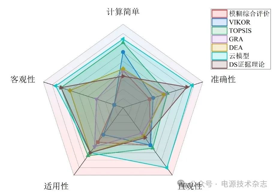 綜合評價方法可分為主觀評價法、客觀評價法以及其他評價法,主觀評價法包括模糊綜合評價法、VIKOR法等;客觀評價法包括優(yōu)劣解距離法(TOPSIS)、灰色關(guān)聯(lián)度法((GRA)、數(shù)據(jù)包絡(luò)分析法(DEA)等;其他評價方法如云模型法、DS證據(jù)理論法等在綜合評價中也應(yīng)用廣泛。