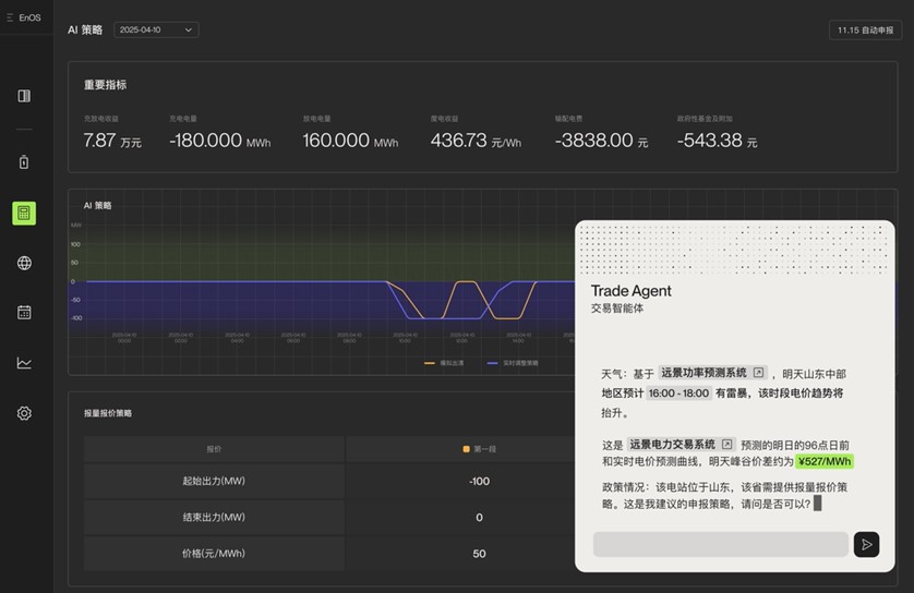 基于精準(zhǔn)電價(jià)預(yù)測(cè),遠(yuǎn)景交易智能體自動(dòng)整合實(shí)時(shí)設(shè)備狀態(tài)信息、各地交易規(guī)則策略模型,自生成AI交易策略,實(shí)現(xiàn)自動(dòng)申報(bào)及控制閉環(huán),還可以根據(jù)交易結(jié)果,自動(dòng)復(fù)盤,持續(xù)優(yōu)化交易策略;遠(yuǎn)景交易智能體還打通了交易、生產(chǎn)和運(yùn)維,通過智能排程,確保全生命周期收益最優(yōu)。