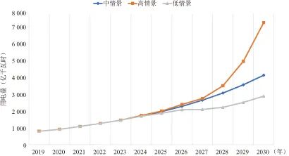 本研究采用德爾菲法與歷史數(shù)據(jù)分析法相結(jié)合的方法,對2030年我國算力用電需求進(jìn)行了多情景預(yù)測?;谌斯ぶ悄芗夹g(shù)的發(fā)展軌跡,構(gòu)建了高、中、低3種差異化發(fā)展情景:高情景下,人工智能爆發(fā)式增長,2030年我國算力中心用電預(yù)計將超過7 000 億千瓦時,占全社會用電量的5.3%;中情景下,人工智能勻速增長,2030年我國算力中心用電預(yù)計將超過4 000 億千瓦時,占全社會用電量的3.0%;低情景下,人工智能慢速增長,2030年我國算力中心用電預(yù)計將達(dá)到約3 000 億千瓦時,占全社會用電量的2.3%(見圖1)。盡管目前我國算力中心用電量在全社會電力消耗中所占比例不大,短期內(nèi)用電量的攀升仍在電力系統(tǒng)可支持范圍內(nèi),但其快速增長的趨勢不容忽視。