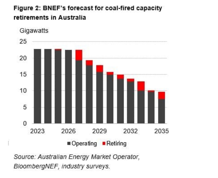 圖3 BNEF對(duì)澳大利亞燃煤發(fā)電廠2023~2035年運(yùn)營(yíng)和退役的預(yù)測(cè)