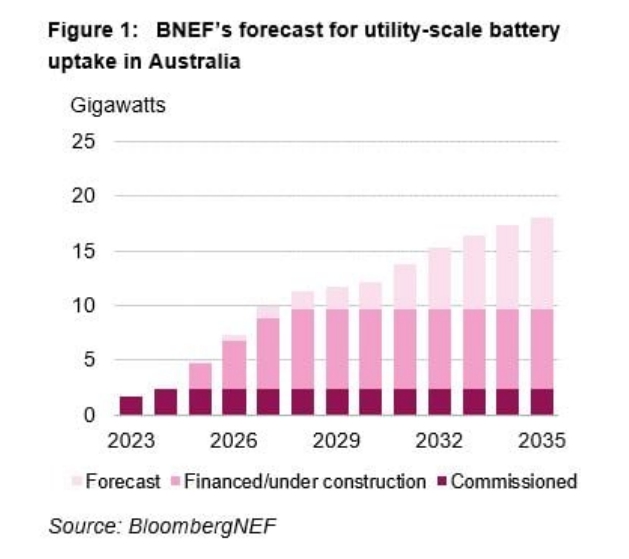 中國(guó)儲(chǔ)能網(wǎng)訊:日前,研究機(jī)構(gòu)彭博新能源財(cái)經(jīng)公司(BNEF)指出,到2035年,澳大利亞部署公用事業(yè)規(guī)模電池儲(chǔ)能系統(tǒng)裝機(jī)容量可能會(huì)增加8倍,從2024年的2.3GW增長(zhǎng)到18GW。
