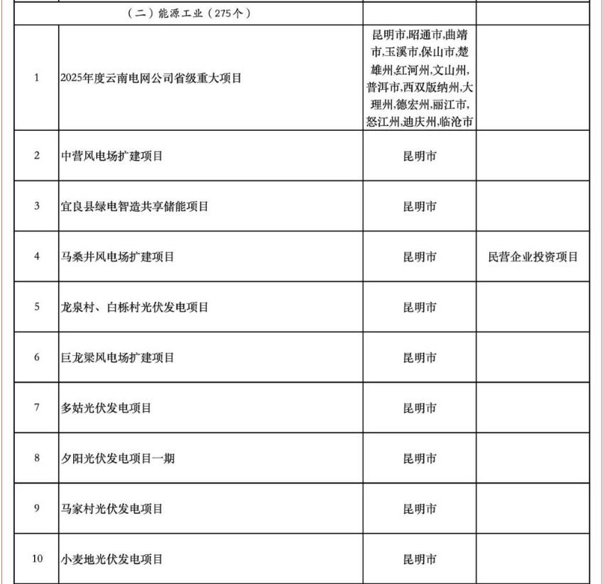 中國儲能網(wǎng)訊:4月12日,云南省發(fā)改委公布云南省2025年度省級重大項目清單和“重中之重”項目清單。重大項目清單涉及1775個項目,其中,能源工業(yè)項目275個。包含10個光伏制造項目,210個光伏發(fā)電項目;風(fēng)電項目18個?!爸刂兄亍表椖壳鍐喂灿?6個,涉及風(fēng)電項目3個,規(guī)模共計1.01GW。