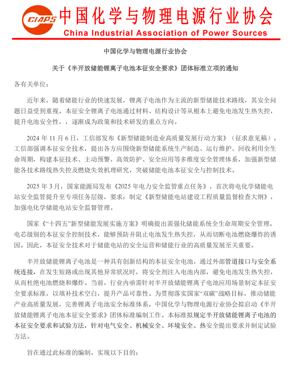 半開放儲能鋰離子電池(簡稱“半開放電池”)由好風(fēng)光儲能和清華四川院共同合作開發(fā)。這是一種具有創(chuàng)新結(jié)構(gòu)的本征安全電池,通過外部管道接口與安全系統(tǒng)連接,在發(fā)生短路或出現(xiàn)其他異常狀況時,將安全劑注入電池內(nèi)部,避免電池發(fā)生熱失控,從而杜絕電池燃燒和爆炸。當(dāng)前,行業(yè)內(nèi)亟需針對半開放電池應(yīng)用場景制定本征安全要求標(biāo)準(zhǔn),以填補(bǔ)技術(shù)空白,提升產(chǎn)品可靠性。為此,中國化學(xué)與物理電源行業(yè)協(xié)會啟動《半開放儲能鋰離子電池本征安全要求》團(tuán)體標(biāo)準(zhǔn)的編制工作。本標(biāo)準(zhǔn)擬規(guī)定半開放電池的本征安全要求和試驗方法,針對電氣安全、機(jī)械安全、環(huán)境安全、熱安全提出要求并制定試驗方法。相關(guān)工作將推動儲能產(chǎn)業(yè)高質(zhì)量發(fā)展,并進(jìn)一步完善鋰離子電池安全標(biāo)準(zhǔn)體系,具有重要的行業(yè)引領(lǐng)作用。