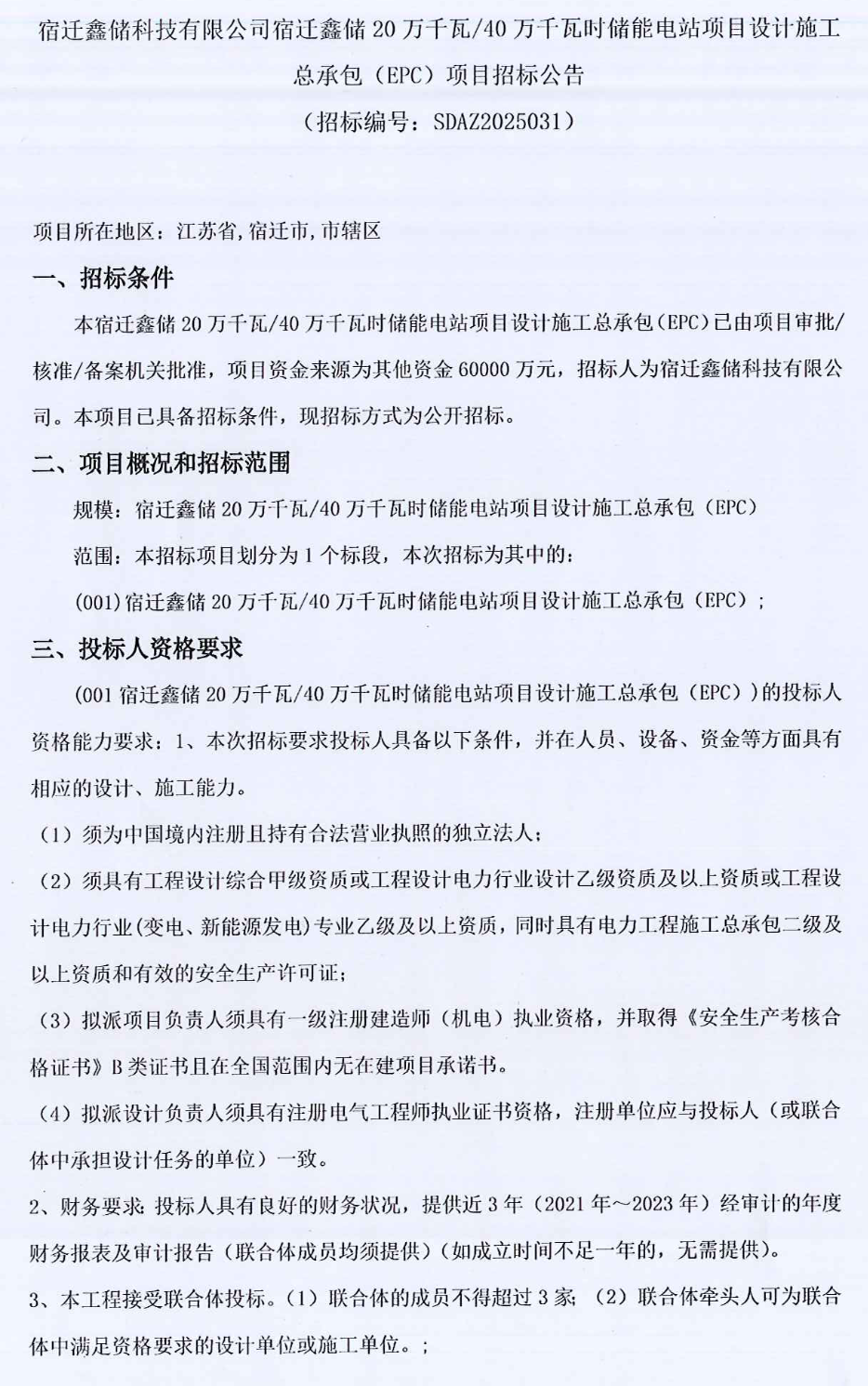 中國(guó)儲(chǔ)能網(wǎng)訊:4月15日,宿遷鑫儲(chǔ)發(fā)布200MW/400MWh儲(chǔ)能電站設(shè)計(jì)施工EPC招標(biāo),據(jù)悉該項(xiàng)目位于江蘇省宿遷市,項(xiàng)目資金預(yù)算6億元,相當(dāng)于單價(jià)1.5元/Wh。