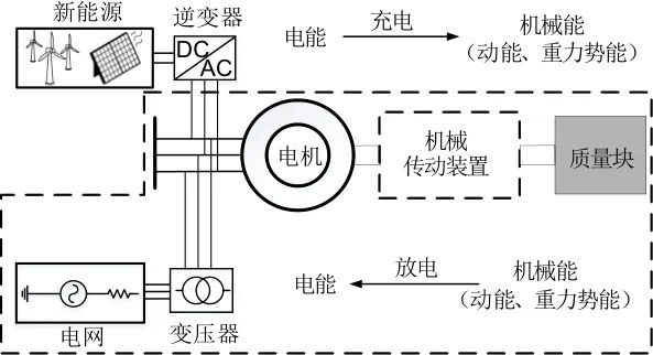 重力儲能系統(tǒng)運行分為充放電兩種工況,其能量轉化過程如圖2所示。充電工況下,重力儲能系統(tǒng)從新能源側獲取電能,電機工作于電動工況,轉子旋轉帶動質量塊從低勢能位向高勢能位移動,電能轉化為重力勢能。放電工況下,質量塊從高勢能位釋放,向低勢能位移動,反拖電機轉子發(fā)電,重力勢能轉化為電能回饋至電網(wǎng)。