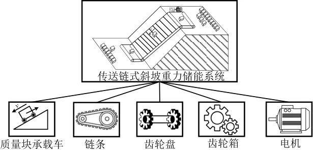 傳送鏈式斜坡重力儲能系統(tǒng)主要由質量塊承載車(包含質量塊)、鏈條、齒輪盤、齒輪箱以及電機五個部分組成(圖1)。質量塊(放置于承載車中)作為固體儲能介質,是電能與重力勢能相互轉換的媒介。鏈條與質量塊承載車相互銜接,起到傳動作用;包圍鏈條的支撐軌道起動支撐作用;齒輪盤與鏈條相互銜接,起動力傳輸作用;齒輪箱利用主從輪的齒數(shù)差,起改變輸出轉速及轉矩的作用;電機作為電動/發(fā)電設備,系統(tǒng)充電時為質量塊提供動力,系統(tǒng)放電時質量塊重力勢能轉化為電能回饋至電網(wǎng)。